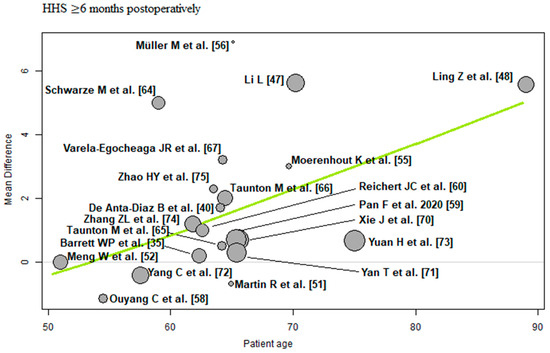 Bubble plot of the predictor patient age and the outcome parameter HHS ≤ 3 months postoperatively. The slope of the regression line (in green) is large (steep line), which shows that the predictor has a strong influence on the outcome variable. HHS: Harris hip score [35,40,47,48,51,52,55,56,58,59,60,64,65,66,67,70,71,72,73,74,75].