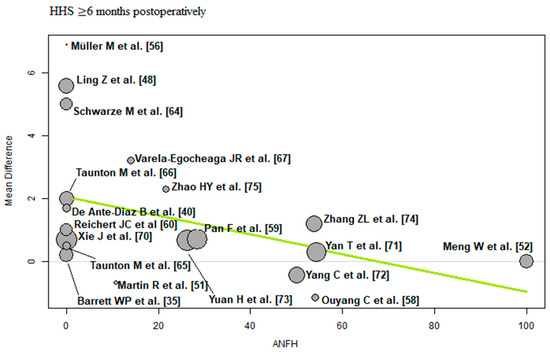 ANFH: Of the 19 RCTs [35,40,48,51,52,56,58,59,60,64,65,66,67,70,71,72,73,74,75] with 1594 THAs reporting ANFH, a negative association (predictor estimate = −0.03) was found between ANFH and HHS ≥ 6 months postoperatively. For every 1 percentage point increase in the incidence of ANFH, the effect size for HHS ≥ 6 months postoperatively decreased by an average of 0.03 points (p = 0.04; Figure 9).