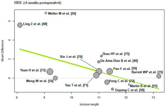 Bubble plot of the predictor incision length and the outcome parameter HHS ≤ 3 months postoperatively. The slope of the regression line (in green) is large (steep line), which shows that the predictor has a strong influence on the outcome variable. HHS: Harris hip score [35,40,48,51,52,56,58,59,70,71,72,73,75].
