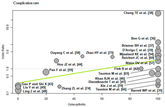 Bubble plot of the predictor osteoarthritis and the outcome parameter complication rate. The slope of the regression line (in green) is large (steep line), which shows that the predictor has a strong influence on the outcome variable [35,36,37,38,39,41,42,43,44,46,48,49,54,57,58,59,60,65,66,70,74,75].