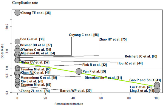Bubble plot of the predictor femoral neck fracture and the outcome parameter complication rate. The slope of the regression line (in green) is large (steep line), which shows that the predictor has a strong influence on the outcome variable [35,36,37,38,39,41,42,43,44,46,48,49,54,55,57,58,59,60,65,66,70,74,75].