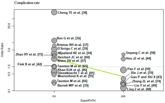 SuperPATH surgical technique and the complication rate showed a negative association. For each 1 percentage point increase in the frequency of SuperPATH, the effect size for the complication rate decreased by an average of 1.72. The more often SuperPATH was used as a minimally invasive approach, the more significantly the complication rate of minimally invasive THA decreased compared with the conventional approach. A recently published meta-analysis by Ramadanov [80] showed no differences in complication rates between SuperPATH and conventional approaches in THA.
