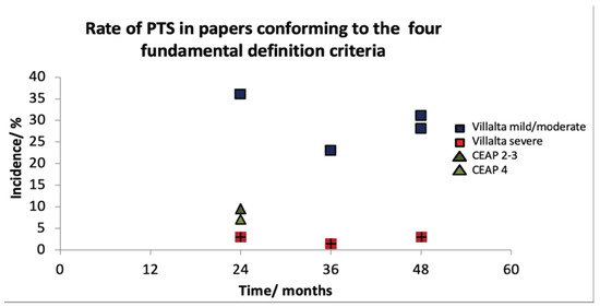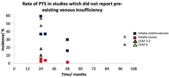 Four papers conformed to our PTS definition criteria [23,27,28,38]. The rate of mild or moderate PTS in patients was 7–36% (Table 2). The rate of severe PTS in these patients was 1.5–3%. PTS incidence narrowed (23–36%) when studies using CEAP scores were removed. When the criterion of assessment of pre-existing venous insufficiency was omitted, a further seven papers could be included [20,26,33,34,35,36,37]. The resulting rate of PTS increased, and the range widened to 16–59% for mild or moderate but remained similar for severe PTS (1.6-5.9%) (Table 3). Incidence remained unaffected by time after 24 months (Figure 2 and Figure 3).