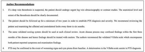 - PTS manifestations during the follow-up period should be confirmed as new or a significant worsening from baseline. This emphasises the importance of initial assessment and documentation of bilateral lower limb venous drainage at the time of the index DVT [7,22,23,24,25,26,27,28].
