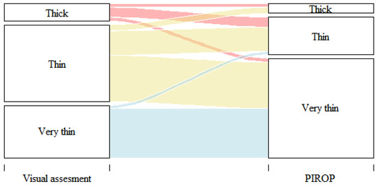 In the visual assessment, most cases (85%) presented a thin or very thin phenotype. The thin phenotype was diagnosed in 68 children, while the very thin phenotype was diagnosed in 97 children. The highest, 94%, agreement of the visual assessment with the biometric ultrasound measurements was shown in the case of a very thin biotype (Spearman’s rank correlation coefficient r = 0.37, p < 0.01) (Table 1 and Figure 1). In 17 cases, their GP was assessed visually as being thick but, in the ultrasound measurements, was classified as thin (12 children) and very thin (5 subjects).