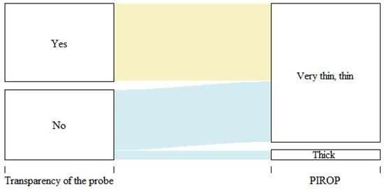 During the assessment of GP with the TRAN method, in 102 cases (53%), the periodontal probe was visible through the margin of the gingiva, while in 91 children (47%), it was not visible (Table 2). The biometric ultrasound measurements in 101 out of 102 children (99.02%) confirmed thin and very thin gingivae (Spearman’s rank correlation coefficient r = 0.49, p < 0.001). Most cases (86.81%) in which the periodontal probe was not visible (thick GP) were classified as thin based on the ultrasound measurements. Only twelve thick GPs (13%) were confirmed using the biometric measurements (Figure 2).