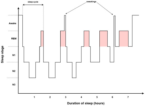 Sleep is a complex physiological state of reduced responsiveness to external stimuli and easily reversed loss of consciousness. Modern sleep-tracking devices brought into general use, such as wearable sensors or mobile sleep-monitoring apps, provide data demonstrating 7.27 h as a mean value of sleep duration for women and 7 h for men [1]. However, as the duration varies from person to person on account of numerous variables, including age, body mass index, medical status, or heritability, defining the universal optimal time spent on sleeping remains impossible [2,3,4,5]. Average sleep consists of four to six sleep cycles, which reflect the impact of ultradian rhythm; within one cycle, non-rapid eye movement (NREM) and rapid eye movement (REM) sleep can be distinguished. Despite being ubiquitous throughout one’s whole life, sleep is still widely regarded as a mysterious process, whose function in maintaining homeostasis is not apparent as it might appear at first sight and is not precisely identified. Sleep is regulated by the interplay of the circadian cycle and sleep homeostasis, independently determining sleep and sleep-related processes [6]. Circadian cycles are repetitive 24 h of sleep–wake patterns, that are kept under the control of the suprachiasmatic nuclei of the hypothalamus (commonly called the master circadian pacemaker), and provide functional adjustment to the light-dark cycle. Homeostatic sleep changes are provided by enhanced sleep pressure that strengthens during waking hours (and presumably during REM sleep). Poor sleep quality may lead to immediately noticeable detrimental consequences, such as heightened stress response or somatic symptoms including frequent headaches and abdominal discomfort. Mental issues, commonly in the form of severe emotional stress and cognitive deficits, are also considered as the outcome of sleep disturbances. Additionally, prolonged sleep deprivation increases the likelihood of obesity, cardiovascular disease, diabetes mellitus, or cancer development and, therefore, a risk of all-cause mortality [7].