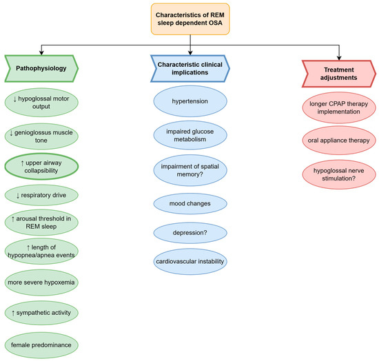 Characteristics of rapid eye movement (REM) sleep phase-related obstructive sleep apnea (OSA) phenotype. The pathophysiological and clinical features of OSA specific for REM-OSA phenotype. Pathogenesis of REM includes a decrease in hypoglossal motor output, and therefore decrease in genioglossus muscle tone during REM sleep leading to increased upper airway collapsibility. The described sequence of events in OSA patients is associated with more frequent and prolonged hypopnea-apnea events and severe desaturations during REM sleep. Additionally, REM-OSA has been described to increase sympathetic activity during REM sleep. The sleep phase-related OSA phenotypes may also be distinguished by clinical manifestations and comorbidities of OSA. REM-OSA has been described to contribute to cardiovascular instability, including increased risk of hypertension, impaired glucose metabolism, mood changes, depression, and possible impairment of spatial memory. Different endotypes underlying REM-OSA phenotype may influence the therapeutic approach. REM-OSA patients with increased upper airway collapsibility may benefit from long-er CPAP therapy to cover most of the REM sleep stages, oral appliance therapy, as well as hypoglossal nerve stimulation to increase the genioglossus muscle tone and prevent the upper airway collapse during REM sleep. Legend: OSA—obstructive, REM—rapid eye movement sleep.
