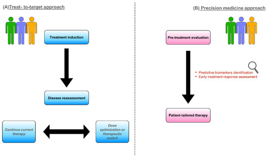 Predicting the response to biologic drugs, therefore, would be of utmost importance to directly choose the most appropriate therapy for the single patient, helping to further improve clinical care and cost-effectiveness. Thus, in recent years, physicians’ attention has been primarily directed toward individualized treatments, pursuing an approach based on so-called precision medicine [5]. The European Crohn’s and Colitis Organization (ECCO) has highlighted the key role of precision medicine in IBD in a recent scientific workshop aiming to provide an updated overview on this specific topic. ECCO underlines how clinical features have a limited capacity for guiding clinicians’ choices and that there is an unmet need for more objective predictive biomarkers [6]. It is therefore easy to understand why, in the last few years, studies investigating potential predictors of disease course or treatment response have flourished. Many predictive markers have been examined among clinical, serologic, genetic, endoscopic, and radiologic factors [5]. A graphic synthesis of the treat-to-target and precision medicine approaches is represented in Figure 1.