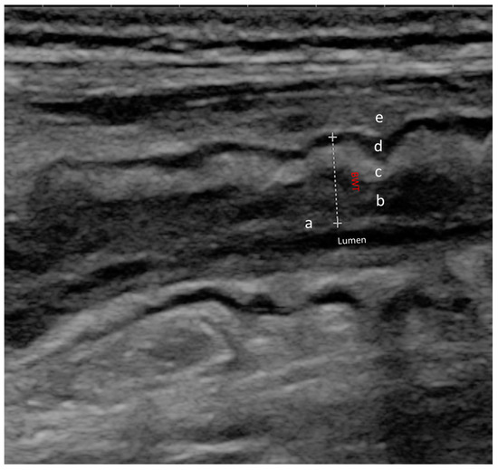 Normal ultrasound bowel wall stratification The bowel wall is composed of five different layers with different echogenic patterns. In order from the innermost to the outermost layer, we can observe: (a) mucosa-lumen interface; (b) muscolaris mucosae; (c) sub-mucosa; (d) muscolaris propria; (e) serosa and extramural structures (peritoneum, fat); BWT (dotted line) is the distance between the lumen-mucosal interface and the serosa.