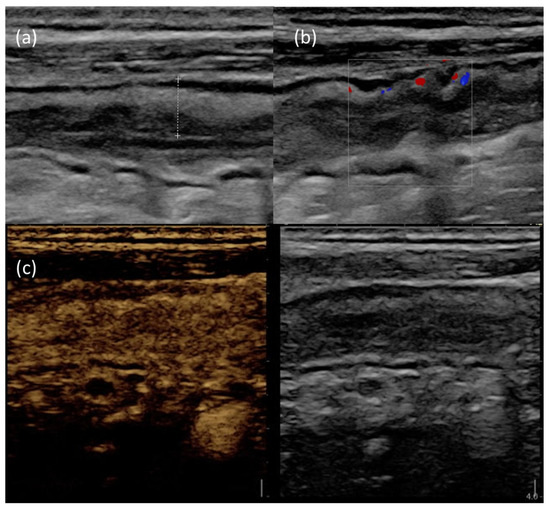 Some recent studies have investigated the role of CEUS in predicting the response to biologic treatment in CD, and the results agree in underscoring how different CEUS parameters are associated with long-term outcomes [35,36]. In a previous study, our group demonstrated that CEUS may be a predictor of endoscopic and clinical response. We evaluated a cohort of 54 CD patients receiving anti-TNFα and performed D-CEUS at the time of therapy induction and at multiple following time points, aiming to analyze the correlation between D-CEUS and long-term (12 months) endoscopic and clinical response [37]. After two weeks of treatment, the decrease of four D-CEUS parameters (peak intensity—PI; AUC; slope coefficient of wash in—Pw; mean transit time—MTT) was significantly higher in patients who achieved endoscopic response compared with non-responders. In addition, patients who experienced relapse within six months showed a significantly lower reduction in PI and Pw delta, a significant reduction in time to peak (TP) after 12 weeks of treatment, and a significantly lower decrease in AUC at 6 and 12 weeks. Similarly, Quaia et al. investigated the role of CEUS in the early prediction of the long-term response to anti-TNFα therapy. They enrolled 115 consecutive patients who underwent CEUS before starting and after six weeks of treatment. The authors found that percentage changes of the peak enhancement, AUC, AUC during wash-in, and AUC during wash-out were predictors of long-term therapeutic outcomes (p < 0.05).