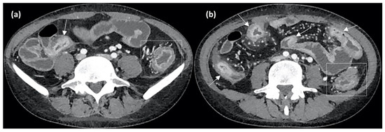 Axial CT enterography (CTE) images after contrast medium injection show wall thickening of the terminal ileum (arrow in (a)) and of other small bowel loops (arrows in (b)), with stratified contrast enhancement due to hyperdense aspects of the mucosal layer and hypodensity of the submucosal layer, indicating active inflammation. Perienteric fat stranding and local hypervascularization (asterisks in (b)) and left colonic wall thickening (rectangles in (a,b)) are also evident.