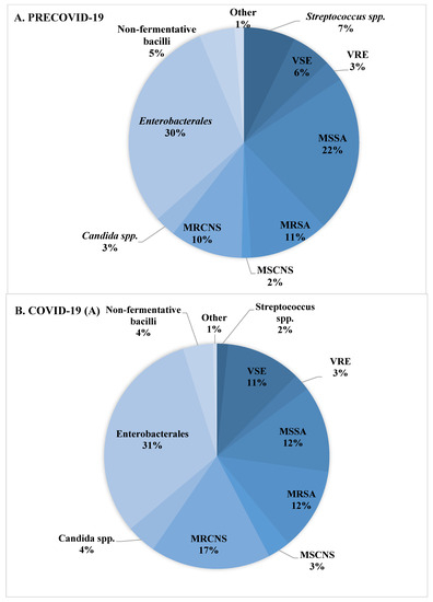 BSIs are another common complication in patients with severe COVID-19, with limited data available, and most studies have been conducted in critically ill patients in the ICU. It has been shown that a total of 7% of hospitalized COVID-19 patients may develop BSIs, with a mortality rate of about 40% [9]. COVID-19 patients are three times more likely to develop BSI compared to patients hospitalized for other reasons than SARS-CoV-2 infection [7]. As shown by several studies, the highest increase in incidence during the surge of COVID-19 was observed for Acinetobacter baumannii, carbapenem-resistant Klebsiella pneumoniae, Pseudomonas aeruginosa, methicillin-resistant Staphylococcus aureus (MRSA), and Enterococcus [11,12,13,14]. A high proportion of multi-drug-resistant organisms causing BSIs in patients with COVID-19 suggests that the overuse of antibiotics plays a major role in the selection of bacterial strains resistant to pharmacological treatment. In addition, reported statistical data were certainly influenced by healthcare service crises related to the implications of the COVID-19 pandemic, e.g., absences of medical staff, difficulties in implementation of infection prevention and control programs in hospitals, screening for the carriage of resistant pathogens, and isolation and cohorting of patients [8,9,15,16].