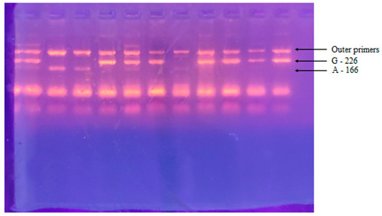 Agarose electrophoresis after PCR reaction. Lanes 1–11 show amplification of PCR products. A 226bp PCR product corresponds to a G allele. A 166bp PCR product corresponds to A allele. A 330bp PCR product is visualized after amplification with an outer primer pair.