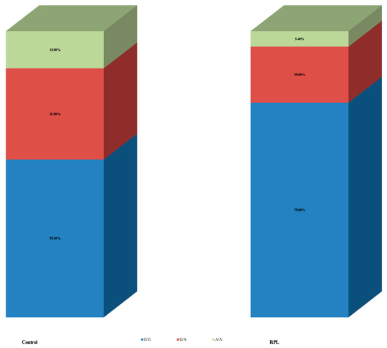 The results presented were classified according to specific zones following electrophoresis (Figure 1). The ANRIL rs4977574 gene polymorphism results between the control and RPL groups are shown in Table 2. Women in the control group had allele A in a significantly higher frequency compared to RPL [31 (44.9%) control vs. 14 (25%) RPL, p = 0.021]. Of them, nine women (13.0%) in the control group and three (5.4%) in the RPL were homozygous for allele A (genotype A/A). When analysis was based on specific genotypes, the results did not reach statistical significance (p = 0.062) (Figure 2).