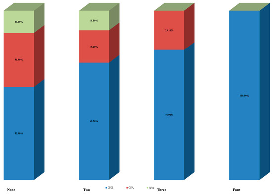 Table 3 summarizes the results following stratification according to the number of pregnancy losses. The first group (None) represents the control group, which included women with no pregnancy losses. Even though results did not reach statistical significance (p = 0.078), there was a pattern of gradually decreased prevalence of allele A with an increasing number of pregnancy losses. Thirty-one (44.9%) of women in the control group had at least one allele A, eight (30.7%) with two pregnancy losses, six (23.1%) with three, and none with four pregnancy losses. Of them, nine women (13.0%) in the control group, three (11.5%) with two pregnancy losses, and none with three were homozygous for allele A (genotype A/A) (Figure 3).