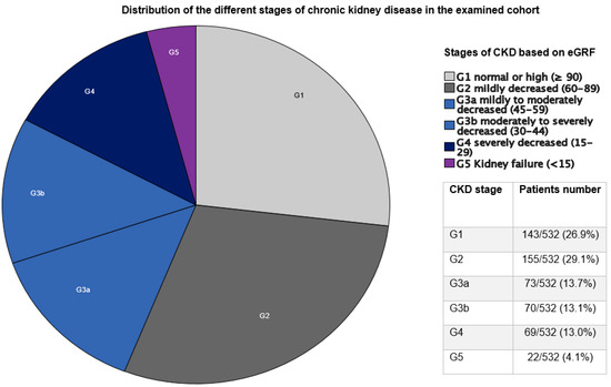 Distribution of the different stages of chronic kidney disease in the examined cohort. CKD: chronic kidney disease; eGFR: estimated glomerular filtration rate; G1 group: patients without CKD; G2/G3a groups: patients with mild–moderate CKD; G3b/G4 groups: patients with moderate–severe CKD; G5 group: patients with kidney failure.