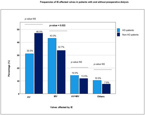 IE caused by staphylococcus aureus was significantly more frequent in the HD group (p = 0.006) (the microbiological findings of both groups are listed in Supplementary Materials, Table S3).