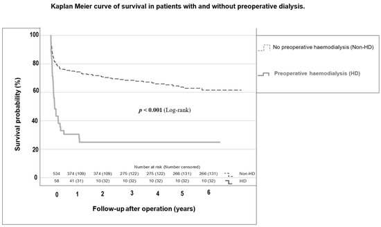 In the whole cohort, 19.4% died 30 days after surgery; 17.4% in the Non-HD group and 38.1% in the HD group (p = 0.001). One year after surgery, 33.7% of the entire group had died; 29.1% in the Non-HD group and 75.6% in the HD group (p < 0.001). HD patients had a median survival of only 1.6 [0.8–2.4] years. The survival probabilities of HD and Non-HD patients are shown in Figure 3. Among all causes of death in deceased patients, only sepsis was significantly more common in HD patients (p < 0.001). The causes of death in the examined population are listed in Supplementary Materials, Table S5.