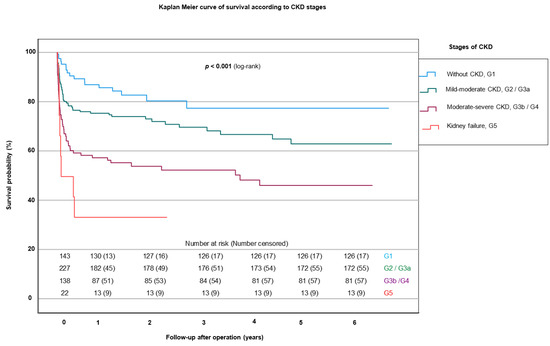 The evaluation of postoperative creatinine levels showed a significance correlating with the underlying stage of CKD (p < 0.001 for each) (see Appendix A, Figure A1).