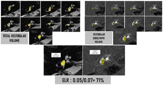 Upper left: T2 SPACE cisternography sequence. Manual delineation using the computer mouse of the anatomical boundaries of the vestibule in each of the slices containing it (yellow line). Once all contours were completed, the software itself calculated the total volume (last image below) and labeled it as VOI (volume of interest). The ampullary dilatations of the semicircular canals (SCCs) were not included in the measurements of total vestibular volume. Upper right: three-dimensional REAL-IR sequence. Manual delineation using the visualization console and computer mouse of the vestibular endolymph in each slice. Note that in this patient, the saccule has a larger volume than the utricle, but they do not merge (corresponding to a mild degree on the four-level vestibular hydrops scale). Volumes of the saccule and utricle were separately outlined, although the software displayed the total volume as a sum of both. Bottom: calculation of the endolymphatic ratio (ELR) corresponding to the percentage of the total vestibular volume occupied by endolymph. In this patient, the saccule and utricle were visualized independently, although the saccule has a larger volume than the utricle. This corresponded to a mild degree of vestibular hydrops on the qualitative/semi-quantitative visual scale of four grades. However, upon performing volumetric measurement and considering the entire volume of endolymph (not just in that particular slice), the ELR provides us with a value of 71%.