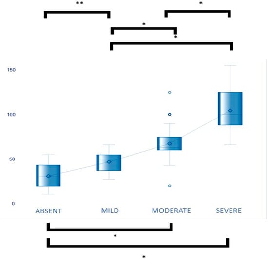 The mean ELRs are grouped according to the qualitative EH grades. The only comparison where there are no significant differences is between the absent-mild groups. In all other comparisons between groups, there are statistically significant differences. * ANOVA p < 0.001 ** ANOVA p = 0.2814 not significant.