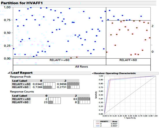 The segmentation tree suggested that ELR of 60% was the optimal threshold. When the score was higher than ELR of 60%, 96.5% of cases were “moderate-severe” (group 2 in the chart, Response Probability, corresponding to 63 blue dots in the chart, Response Counts). When the score was ELR less than 60%, the percentage of “absent-mild” patients was 72.6% (group 0 in the chart, Response Probability, 23 red dots in the chart, Response Counts). By using a ROC curve, we obtained the sensitivity and specificity for the 60% cut-off point, resulting in an AUC of 0.9037.