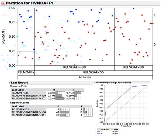 Two cut-off points were generated: 30% and 55%. The probability of having ELR below 30% in the unaffected ear and a qualitative vestibular EH value of “absent” was 95.5% (corresponding to the 26 red dots in the chart above the “RELNOAF < 30”, leaving only one blue dot classified as a qualitative vestibular EH of “moderate-severe”). In this scenario, the value of the AUC was 75.4%, as shown in the ROC curve.