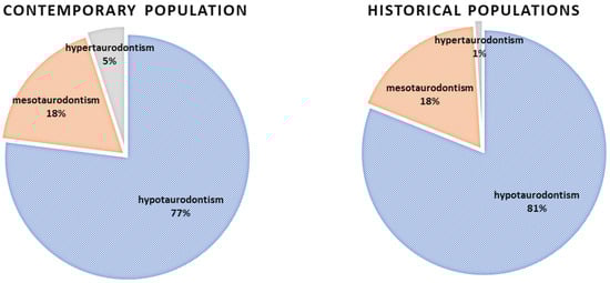 The severity of this anomaly did not significantly vary across contemporary or historical periods, consistent with other findings [18,21]. The gene responsible for taurodontism, linked to X chromosome aneuploidy, may contribute to differences in severity. Some researchers have suggested that the severity of taurodontism might be correlated with the presence of associated systemic disorders such as Down syndrome, Klinefelter syndrome, tricho-dento-osseus syndrome and others [1,9,13,18,25,27].