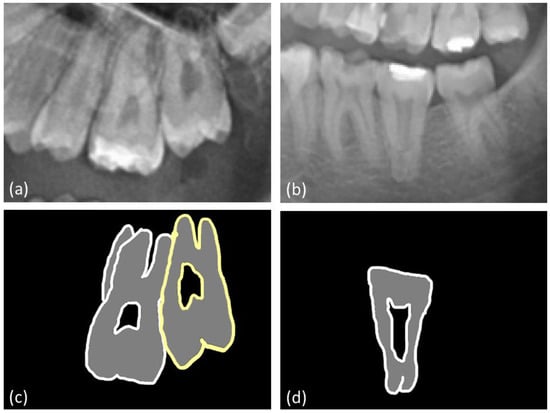 Representative panoramic radiographs of (a) hypotaurodontic, mesotaurodontic, and (b) hypertaurodontic teeth, with corresponding outlines shown below; (c,d).
