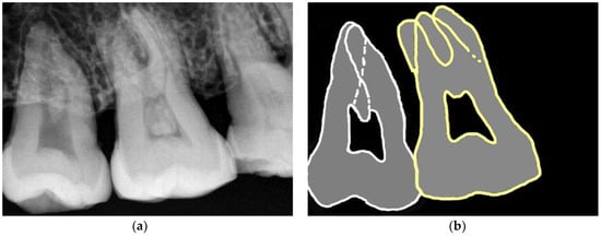 First, 582 panoramic radiographs obtained in 2022 from patients at the Radom Specialist Hospital using a stationary CS 8000C panoramic X-ray unit (Carestream Health, Toronto, ON, Canada) were inspected. For inclusion, the radiographs had to be of high quality, free from artefacts related to improper patient positioning or exposure conditions, and had to display at least one intact multirooted molar without any prior endodontic treatment or prosthetic restoration. Conversely, the exclusion criteria were as follows: radiographs of poor quality; those that did not contain at least one multirooted molar; or those that exclusively contained teeth with prior endodontic treatment, extensive decay, or prosthetic restorations. Based on these criteria, 179 radiographs were excluded, with the remaining 403 radiographs, comprising 2198 multirooted molars, included in the study (see Figure 1). The study encompassed a total of 923 multirooted molars from female participants and 1275 multirooted molars from male participants. The average age of the individuals in the study was 39 years, with a standard deviation of 19 years. The second mandibular and maxillary molars were the most common teeth assessed, each accounting for 22% of the radiographs, while the third mandibular and maxillary molars were the least common, accounting for 13% and 11%, respectively. Ethical approval for conducting the research was obtained from the local bioethics committee under reference number AKBE/135/2023. The available research material did not contain sensitive patient data, such as names or medical history. The nature of the current study was retrospective.