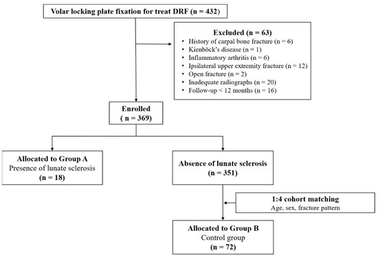Patients who underwent open reduction and internal fixation for DRF between July 2015 and December 2020 were retrospectively analyzed. During this period, 432 underwent VLPF for DRF. Among them, 63 were excluded due to meeting the following exclusion criteria: history of carpal bone fracture (n = 6), Kienböck’s disease (n = 1), or inflammatory arthritis (n = 6); presence of ipsilateral upper-extremity fractures including distal ulnar and shaft fractures, except ulnar styloid process fractures (n = 12), or presence of open fractures (n = 2); and inadequate radiographs for obtaining a true measurement (n = 20). Patients who were not monitored for more than 12 months were also excluded (n = 16). Finally, 369 patients were included in this study. Of them, 18 with subchondral sclerosis with or without cystic changes in the proximal ulnar portion of the lunate identified on preoperative plain radiographs and CT scans were included in Group A (Figure 1A–C). To uniformly match the age, sex, and fracture pattern with a standardized difference of <0.1, 72 patients from among the remaining 351 patients were included in Group B, which was the control group subjected to 1:4 cohort matching using nearest neighbor matching (propensity score matching) (Figure 2) (Table 1). This study was approved by our hospital’s Institutional Review Board (KHNMC 2021-02-012), which waived the requirement for informed consent. All patients’ data were made anonymous and kept confidential. All procedures were indicated and performed in compliance with our department’s standards and the Declaration of Helsinki.