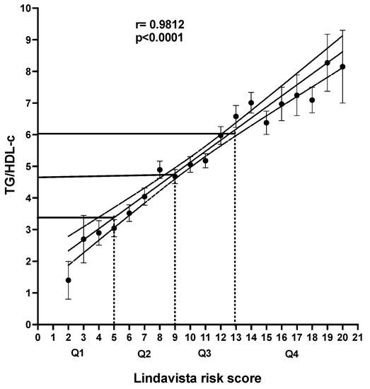 Calibration of the Lindavista score, correlating it with the TG/HDL index. The TG/HDL ratio values were compared with the Lindavista score values divided into quartiles to calibrate the meaning of LS sums. Dotted perpendicular lines represent the quartile values of LS. Meanwhile, the solid horizontal lines express the correspondence between LS estimations and the TG/HDL-c index values. The TG/HDL-c index figures < 3.3, 3.3–4.6, 4.7–6, and >6 correspond to each quartile distribution. It is remarkable the straight linear correlation between both variables.
