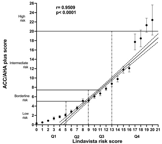 Calibration of the Lindavista score, correlating it with the ASCVD REP score. The correlation between ASCVD REP and quartiles of LS scores is also linear. Both scales coincide with low and borderline risk categories, but the US score system underestimates the LS intermediate and high risk. Most summations corresponding to upper-quartile LS summation correspond to intermediate ACC ASCVD risk.