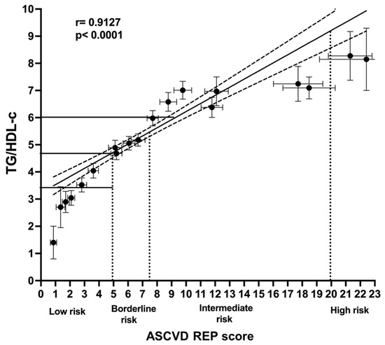 ASCVD REP score correlation with TH/HDL index. Solid horizontal lines correspond to TG/HDL-c risk groups, while dotted perpendicular lines express the four classical ASCVD REP risk groups. Although both variables are linearly correlated and fit correctly into the low-risk categories, the ACC ASCVD REP score grossly underestimates the highest risks.
