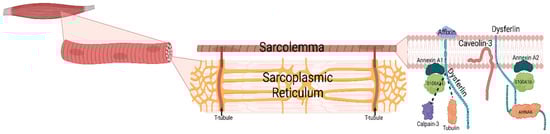 Dysferlin in the sarcolemma. A skeletal muscle is made of fibres. Each fibre is wrapped in a plasma membrane, the sarcolemma, which extends into T-tubules through the sarcoplasmic reticulum. The sarcoplasmic reticulum is made of cavities to stock calcium in the muscles. The sarcolemma is a membrane containing several proteins playing different roles in calcium signalization and membrane repair. Affixin binds to the C-terminal region of dysferlin and shows abnormal localization in dysferlin-deficient muscles [7]. Caveolin-3 also colocalizes with dysferlin, as well as with the dihydropyridine receptor, an L-type Ca2+ channel in the T-tubules [8]. Calpain-3 cleaves annexins A1 and A2, as well as AHNAK, to regulate the dysferlin complex and is Ca2+-dependant [9]. S100A10 forms a complex with annexin A2 and the C-terminal region of AHNAK and then binds to the dysferlin membrane complex [10]. Annexin A1 also creates a complex with protein S100A11 to join dysferlin in participating in Ca2+-dependant membrane repair [11]. Dysferlin also binds with tubulin with its C2A and C2B domains [12].