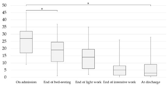 Changes in BDI-II (Beck Depression Inventory Second Edition) scores of completers during inpatient treatment. Data are means with standard deviations (* p < 0.05, repeated analysis of variance (ANOVA)). Admission: 25.53 ± 9.18; end of bed-resting: 18.00 ± 9.53; end of light work: 13.89 ± 8.97; end of intensive work: 6.16 ± 6.38; discharge: 5.63 ± 6.63. p, Bonferroni-adjusted p-value.