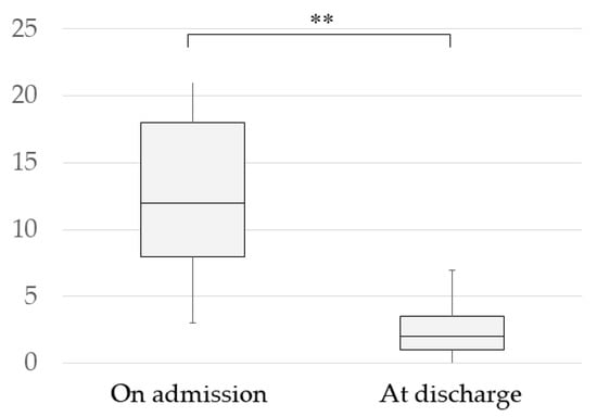 Change in HAM-D (Hamilton Depression Rating Scale) Scores of completers. Data are means with standard deviations (** p < 0.01, paired-samples t-test). Admission: 13.37 ± 5.86; discharge: 2.63 ± 2.03.