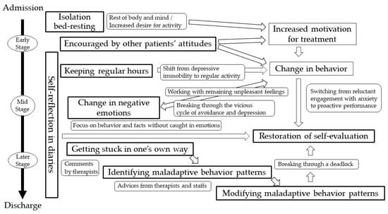 Based on the results of this study, subjective experiences that lead to improvement in depressed patients during inpatient MT were categorized using qualitative data analysis methods [17]. The same method was then used to examine the timing and content of the experiences of these categories, and the relationships among the categories were discussed and developed into a storyline, which is shown in Figure 3.