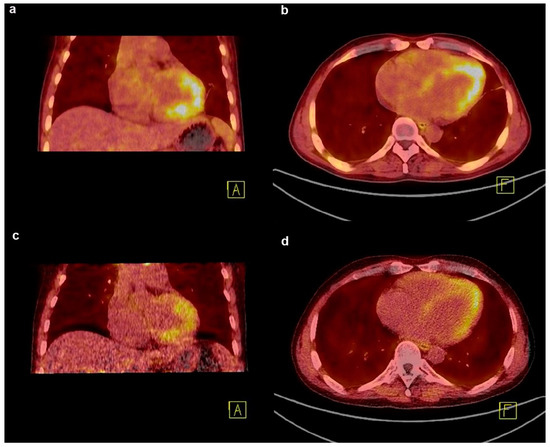 The application of [18F]F-FAPI PET in the response evaluation of cardiac disease. (a,b) FAPI PET/CT image of a patient with eosinophilic leukemia showing an intense uptake in the myocardium at baseline; (c,d) after 2 months of imatinib and prednisolone treatment, the follow-up FAPI PET image shows a decreased uptake in the corresponding area. Adapted from Ref. [58].