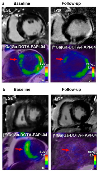 The application of [68Ga]Ga-DOTA-FAPI-04 PET in the prediction of the evolution of LV function. (a) In this patient (male, 66-year-old, with right coronary artery occlusion), large FAPI uptake volume (red arrow) was observed at both baseline and follow-up. Increased left ventricular end-diastolic volume (LVEDV) and left ventricular end-systolic volume (LVESV), and decreased LVEF indicated adverse LV remodelling. FAPI uptake is also shown in the remote non-LGE region (red arrow); (b) in another patient (male, 64-year-old, with left anterior descending coronary artery occlusion), small FAPI uptake volume (red arrow) at baseline and follow-up was observed. Decreased LVEDV and LVESV, as well as increased LVEF indicated better prognosis. Adapted from Ref. [52].