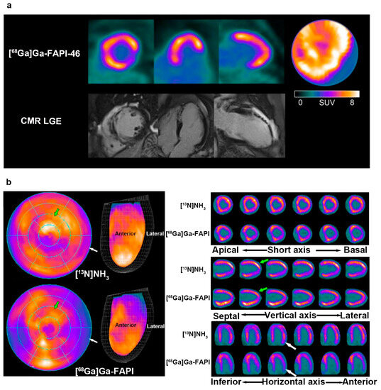 13N-ammonia ([13N]NH3) is a classic tracer used in cardiac PET imaging to evaluate blood flow in the myocardium and coronary arteries [116,117,118]. Interestingly, a patient with liver sarcoma after immunotherapy underwent two PET investigations using [13N]NH3 PET and [68Ga]Ga-FAPI PET [65]. The former manifested a heterogeneously decreased uptake in the LV, whereas an increased and uneven accumulation of [68Ga]Ga-FAPI was observed in the anterior and inferior walls (Figure 6b). The mismatch between the images of the two different tracers suggested an inconsistency in myocardial perfusion and injury caused by ICI-associated myocarditis, unlike that of MI, implying the potential of FAPI imaging in the differential diagnosis of myocardial injury.