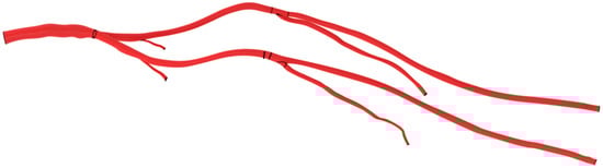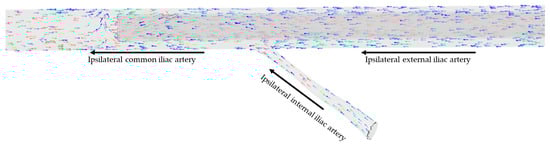 Similarly, a visual examination of the simulations showed that blood circulating in the ipsilateral internal iliac artery, considered null in the case of limitation of the section of the artery by 90%, became negative when considering an arterial cannula with a limitation of the arterial section below 90%, with the blood directed toward the aorta along the arterial cannula (Figure 4).