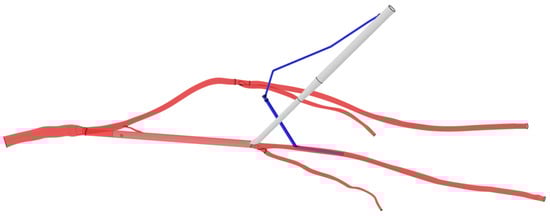 CAD model of the arterial cannula and the distal perfusion in the arterial system. The arterial cannula is white, the DPC is blue and the arteries are red. Black lines represent arterial bifurcations and CAD extremities.