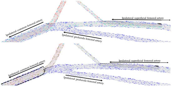 Interestingly, the first part of our study confirmed the findings of Bongert et al. [], who used a CFD model to study the perfusion of a cannulated leg without DPC. Both studies found an antegrade flow toward the non-cannulated side generally greater than that toward the cannulated side, and a negative flow from the ipsilateral superficial femoral artery toward the aorta. In the study by Bongert et al., an analysis of pressure showed the induction of zones of negative pressure close to the tip of the arterial cannula, consistent with the Bernoulli principle []. In our study, the adjunction of the DPC in the simulations revealed that the antegrade blood flow associated with the DPC is counterbalanced by the stealing effect of the arterial cannula, with blood directing from the CFA, PFA, and proximal SFA toward the aorta. This stealing effect can even neutralize the flow of the DPC in the case of the 15 Fr arterial cannula with section limitation by 46% and 6 Fr DPC.