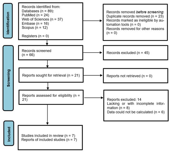 The initial electronic search identified 24 articles in PubMed, 37 in Web of Sciences, 16 in Embase, 12 in Scopus, and none in gray literature. Of the total 89 works, 26 were discarded as duplicates. After reading the titles and abstracts, a further 42 were eliminated leaving a total of 21. A further 14 were rejected as they failed to fulfill the following inclusion criteria: they did not include survival rate data, or they did not include a hazard ratio, odds ratio, or confidence interval. A final total of seven articles were included in the qualitative synthesis. Seven articles were included in the quantitative synthesis as these included all the data and variables required (Figure 1).