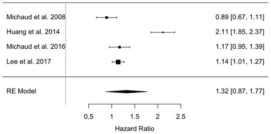 The statistical data collection and analysis were conducted by two authors (A.Z.-M.; J.M.M.-C.). The studies included in the meta-analysis were combined using a random effects model with the maximum likelihood method used for effect size estimation as the odds ratio or hazard ratio. Heterogeneity between the combined studies was assessed using the Q test (p-value < 0.05) and was quantified using the I2. Heterogeneity was considered to be slight if it was between 25 and 50%, moderate between 50 and 75%, and high if > 75%. The existence of statistical significance was assessed using the Z test (p-value < 0.05). Meta-analyses were represented with forest plots. Publication bias was assessed using the trim-and-fill adjustment method and represented with funnel plots.