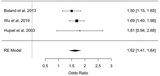 Forest plot of the odds ratio meta-analysis of prostatitis in periodontal patients versus non-periodontal patients [25,26,27].
