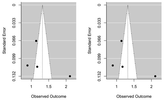 Publication bias was assessed using the Regression Test for Funnel Plot Asymmetry using a mixed-effects model, thus for the HR Test for Funnel Plot Asymmetry meta-analysis, z = 1.2326, p = 0.2177 (Figure 4), whereas for the OR meta-analysis Test for Funnel Plot Asymmetry, z = 0.2515, p = 0.8014 (Figure 5). Both results indicate the absence of publication bias.