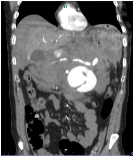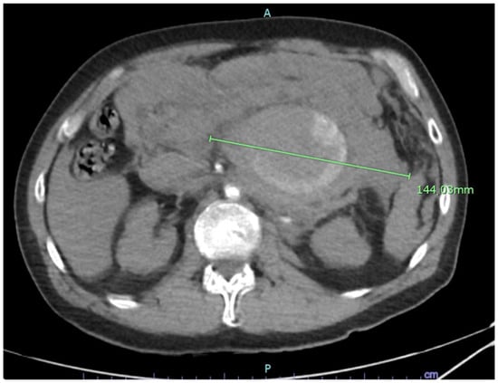 SAAs are the most common visceral artery aneurysm (60% of all VAAs) and the third most common abdominal aneurysm [,,]. Risk factors for a true SAA or pseudoaneurysm (SAPA) are portal hypertension, liver transplantation, pancreatitis, segmental mediolysis, and other forms of vasculitides. It is more frequent in women, and the risk of rupture is high during pregnancy, with extremely high mortality and morbidity for both mothers and fetus [,]. In case of rupture, the prognosis is poor, even in case of prompt open or endovascular treatment [].